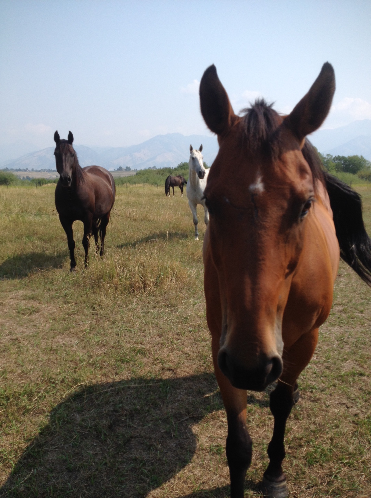 As I make my way towards the small herd I spook a large, orange, white-tailed deer in the thick brush to my right and it bounds deeper into the brush. Later I see two more deer. I’m pretty sure bear have been seen on their land. It’s a different place, this Montana. As I get closer to the herd they begin to walk towards me. All of them.