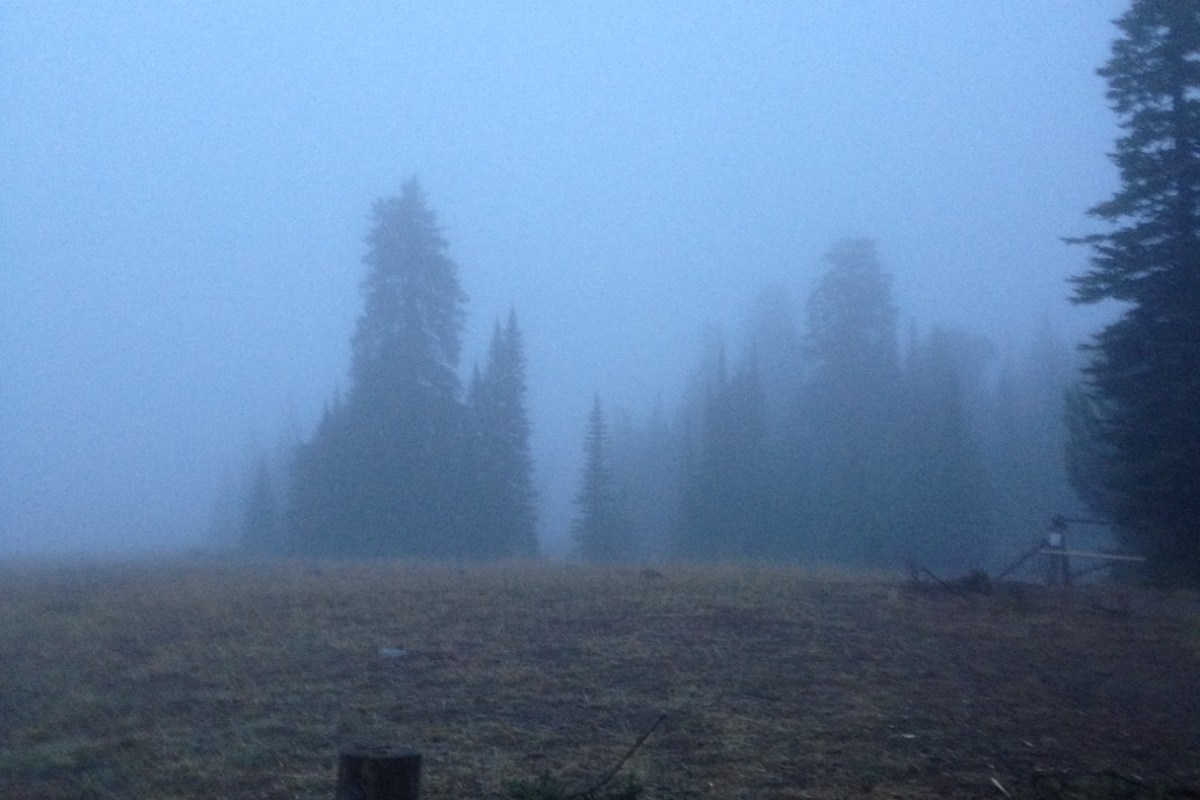 Not much had changed ninety minutes later. The fog had retreated to the meadow a couple of hundred yards in front of the cabin and the rain had stopped but my visual world was still a very small place. Outside, my leftover stack of wood was now a wet, damp mess of a pile and I cursed myself for not putting it under the cabin porch. I grabbed the few dry sticks in the cabin, loaded them into the wood stove, and started a fire to boil water for breakfast and coffee.