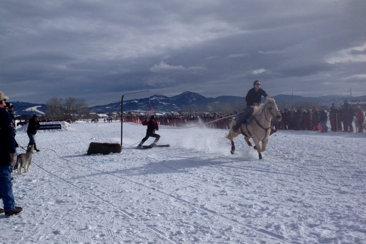 The crowd whooped as the skier landed the jump, groaned as he fell cutting a turn too sharply, and broke into loud applause and cheers when he stood up and brushed the snow off himself. The horse and rider disappeared down the course as the country voice emceeing the event encouraged the crowd to give the downed competitor one more round of applause. Less than a minute later another horse and rider with skier in tow raced down the course, this time staying upright as the crowd encouraged her the whole way.